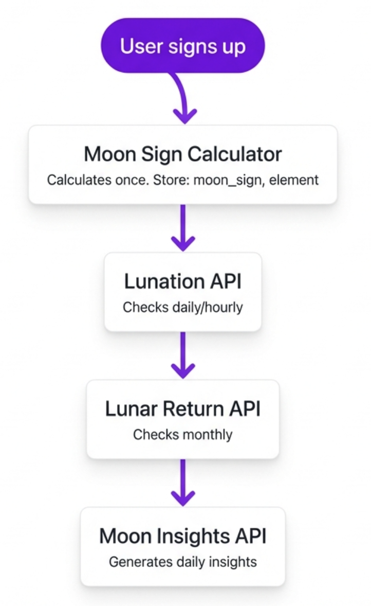 The key insight: moon sign data is calculated once and stored forever (birth data doesn't change). Lunar return is calculated monthly. Current phase can be cached for hours. Only the personalized insights need to be generated frequently.